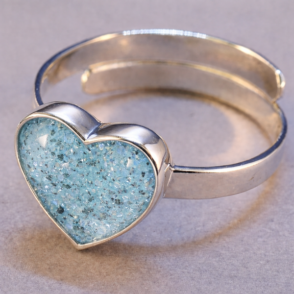 Silver 925 heart shaped ring. Fully adjustable. Let me know your colour and finish preference and I will do my best to match it. Photos of finished piece will be sent to you before posting. Ashes can be hidden or visible.